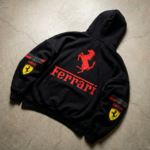 “Llevamos el diseño de carreras al siguiente nivel. Este buzo negro cuenta con estampas en tecnología DTF premium, garantizando una definición increíble en el Cavallino Rampante y máxima durabilidad.